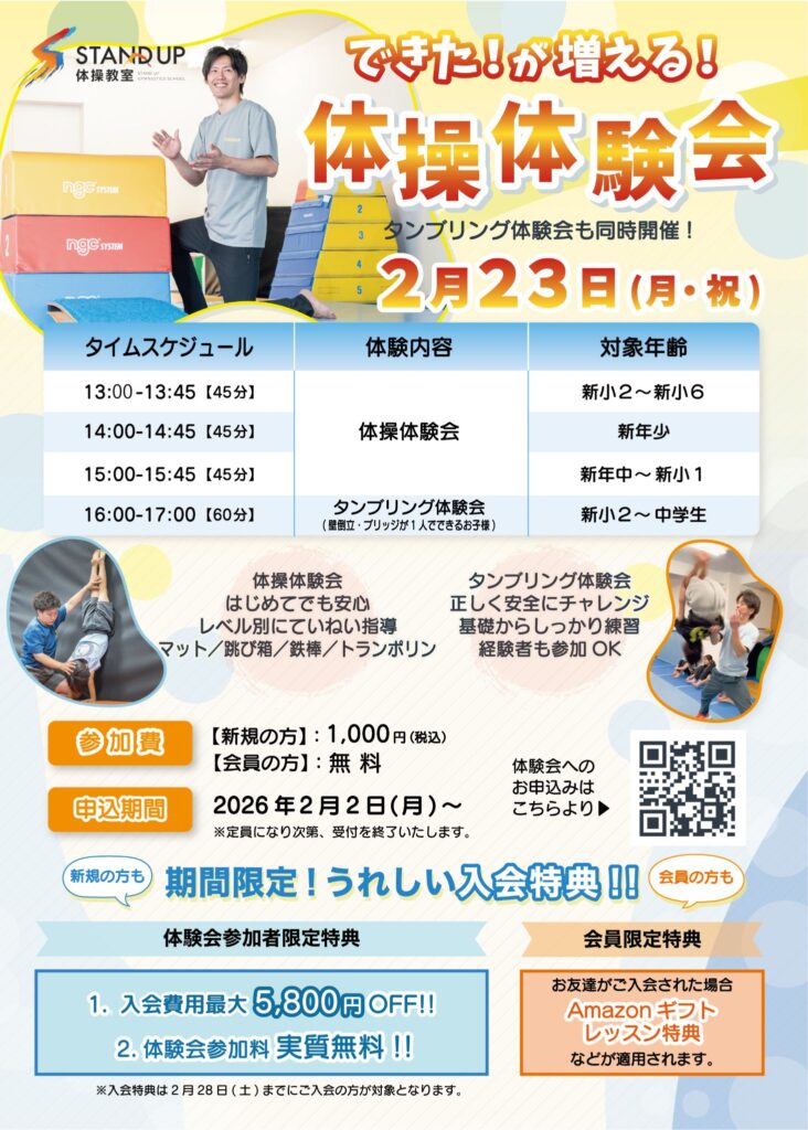 STANDUP体操教室では、体操が初めてのお子さまでも安心して参加できる体験会を開催します✨